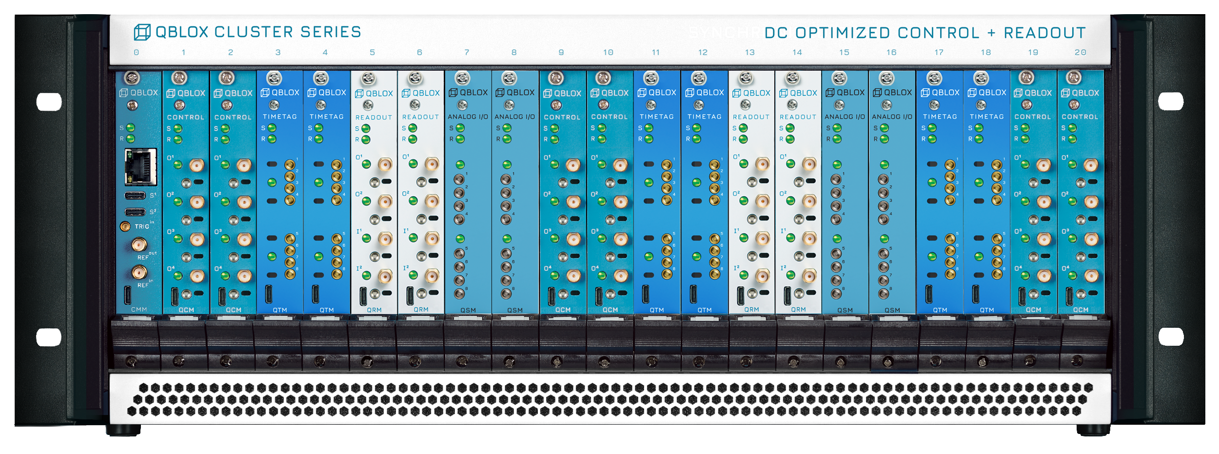 20× module slots: each can be occupied by any module among QSM, QCM, QRM or it can be left unoccupied. New modules can be added at any time when the cluster is switched off as the quantum device scales.