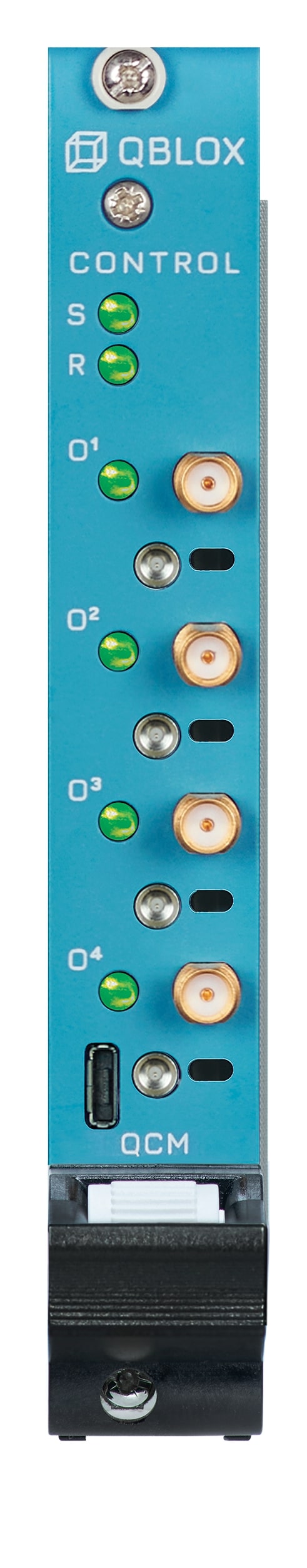The QCM occupies a single slot in either the cluster or the DC cluster. It features four SMA female connectors for pulse output and four SMP male pins for triggering external instruments. The module’s operational status is continuously indicated by 6 LED lights.The front of a QCM module is presented below: