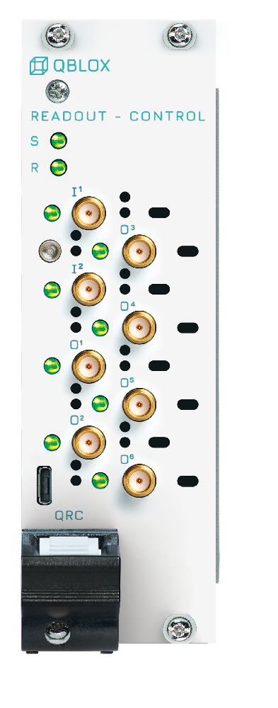 The Quantum Readout and Control (QRC) module is Qblox’s solution for academic and industrial partners aiming to support qubit scaling challenges. As its name suggests, this product is capable of both controlling and reading out qubits while covering a different frequency range than previous offerings. This module is the first in the Qblox lineup to use a direct digital synthesis (DDS) up-conversion scheme with single mixing between the Nyquist zones. This method ensures optimal signal quality at all times. The QRC module features six fully independent ports for signal generation, with a continuous frequency range from 100 MHz to 10 GHz, along with two input channels for readout. Additionally, the module comes with one SMP male pin for triggering. Its operational status is continuously monitored by eight LED lights. The front of a QRC module is presented below: