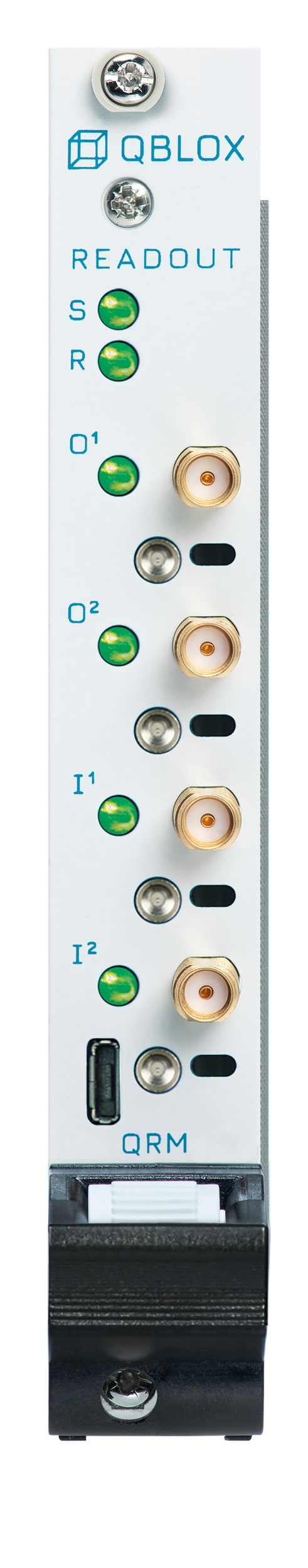 The Qubit Readout Module (QRM) is designed for qubit readout, featuring six on-board Q1 sequencers. Each sequencer is connected to every marker and can access the device’s inputs and outputs along their respective signal paths. In the QRM’s configuration, each sequence processor controls one Arbitrary Waveform Generator (AWG) and one acquisition path. The module includes four SMA female connectors: two for signal output and two for signal input. Additionally, four SMP male connectors are provided for triggering external signals. The operational status of the QRM is continuously monitored by six LED lights. For a detailed explanation of the LED signals. The front of a QRM module is presented below: