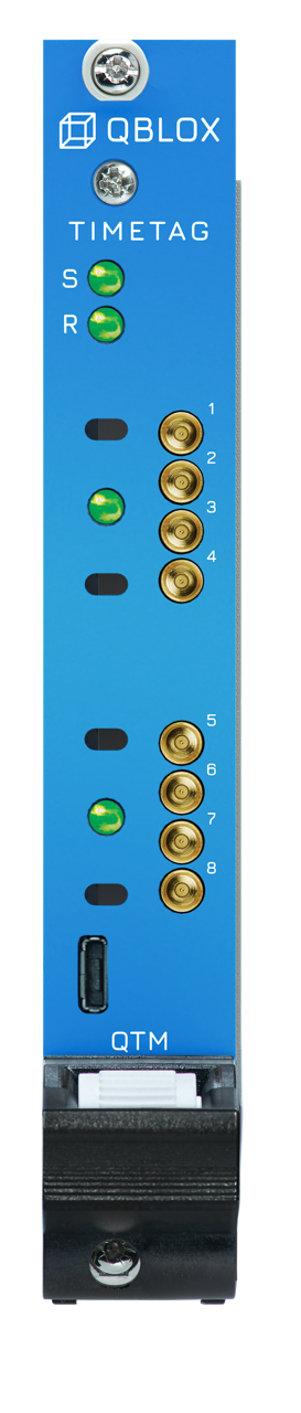The Qubit Timetagging Module (QTM) is Qblox’s solution for timetagging and counting photodetector signals, a crucial function for performing qubit control and readout in optically-addressable qubit systems. The QTM enhances the cluster’s digital signal generation and acquisition by adding timetag acquisition capabilities. The module features eight SMP channels that can be configured as either inputs or outputs. For dynamic operations, each channel has a dedicated Q1 sequencer. The QTM also enables feedback based on photodetector counts and threshold crossing. The module is equipped with eight SMP male pins for input and output, and its operational status is continuously monitored by four LED lights. The front of a QTM module is presented below: